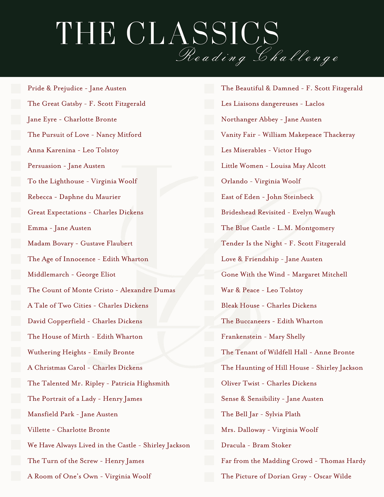Why a classics reading challenge specifically for the girls? Because these are books that stay with you. Stories that ask more than they answer. Books that belong to a world of dimly lit rooms and windswept landscapes, of longing that lingers just beneath the surface, of haunting and injustice. A world where emotions are felt far more than they’re spoken. Where love is rarely simple. Where women stand at the edge of something—freedom, ruin, transformation—with every decision they make.